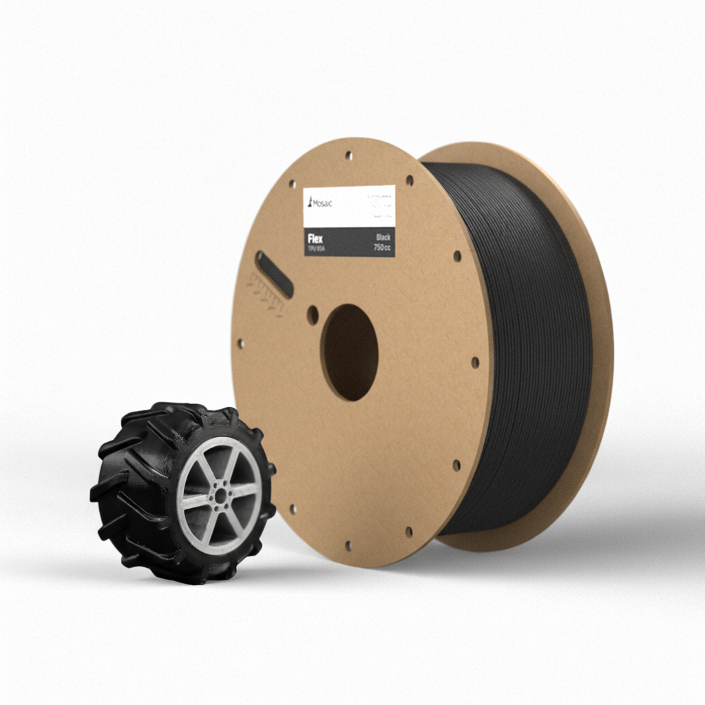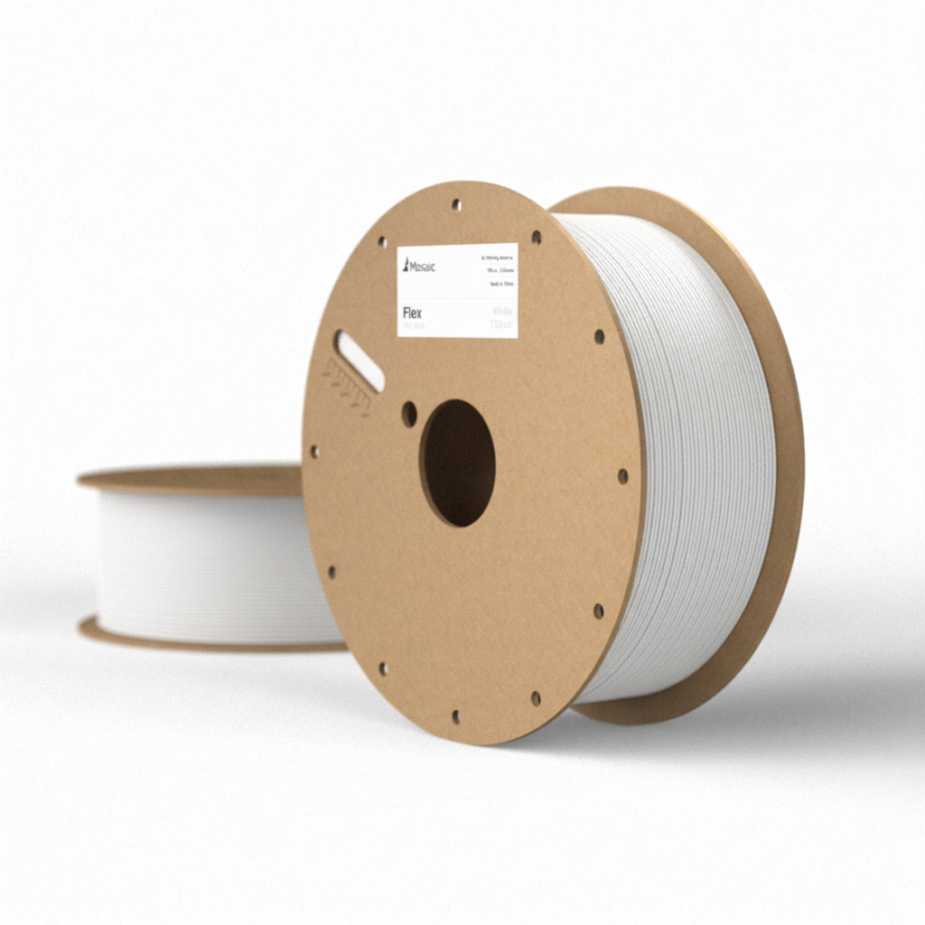 Mosaic Flex is a durable, flexible thermoplastic polyurethane (TPU) filament designed for demanding applications. With a Shore hardness of 95A, it can stretch multiple times its original length while maintaining its shape, making it ideal for prosthetics, footwear, gaskets and seals, and tires.